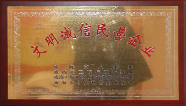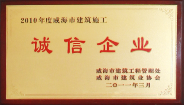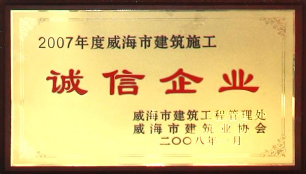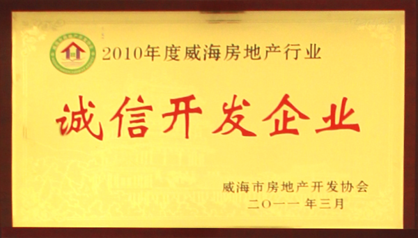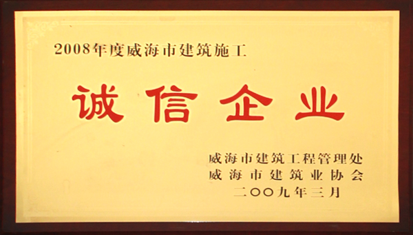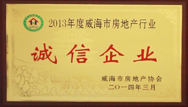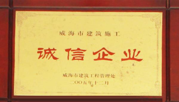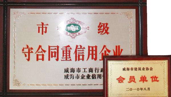 公司連續(xù)八年榮獲威海市“誠信開發(fā)企業”、“建筑施工誠信企業”,連續(xù)九年被評為威海市級“守合同重信用企業”,多次被評為威海市“市級文明單位”、“質量管理先進企業”、 “安全管理先進企業”,乳山市“優(yōu)秀企業”、“先進民營企業”、“納稅明星企業”,在社會上逐步樹立了誠信、穩(wěn)健的企業形象。